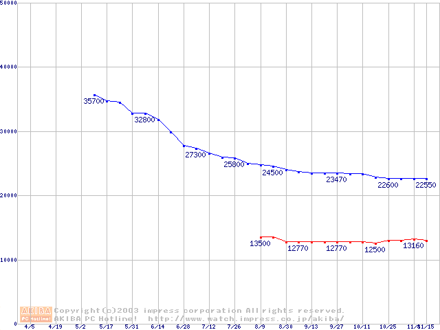| [↑前グラフ]: | MKシリーズ (9.5mm,5400rpm,16MB,FDB)の最安値推移 |