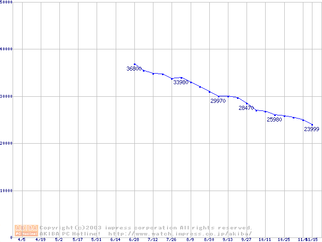 | [↑前グラフ]: | Deskstar 180GXP (7200rpm,2MB,UltraATA/100,FDB)の最安値推移 |