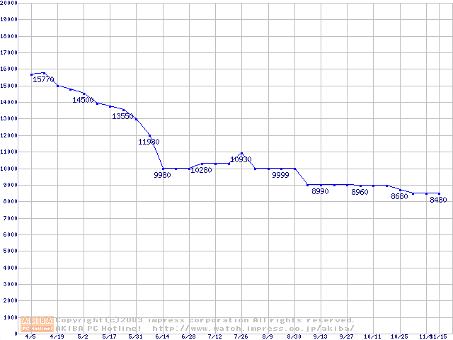 | [↓次グラフ]: | Barracuda 7200.7 (7200rpm,UltraATA/100,8MB,80GB/Platter,FDB)の最安値推移 |