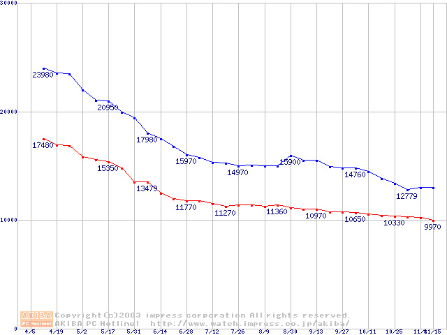 | [↓次グラフ]: | Barracuda 7200.7 (7200rpm,UltraATA/100,2MB,80GB/Platter,FDB)の最安値推移 |