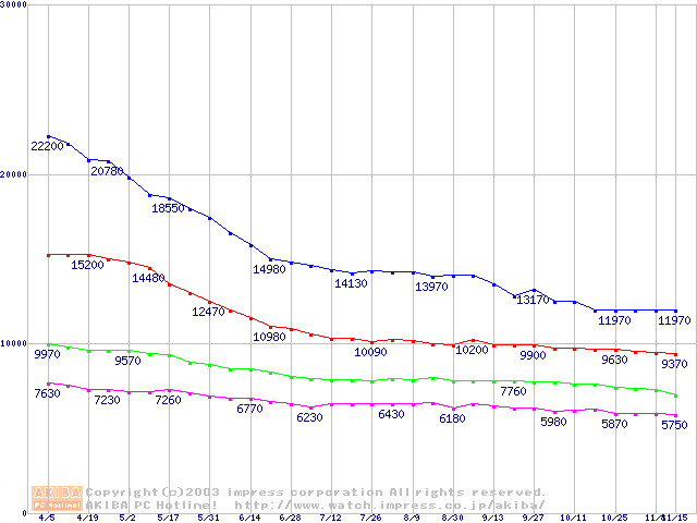 | [↓次グラフ]: | Barracuda 5400.1 (5400rpm,UltraATA/100,2MB,FDB)の最安値推移 |