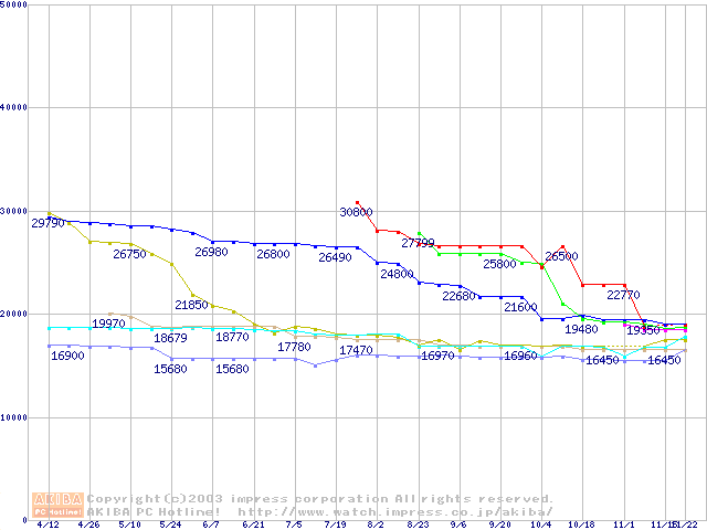 | [↓次グラフ]: | 2.5インチHDD主要製品(最安値2万円~3万円未満)の最安値推移 |