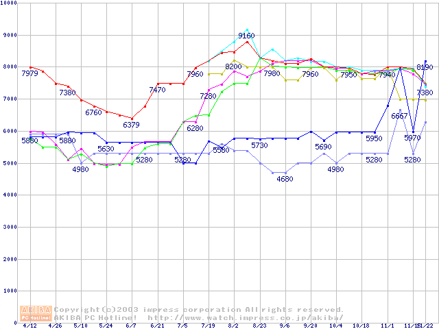 メモリ主要製品(最安値5千円~1万円未満)の最安値推移