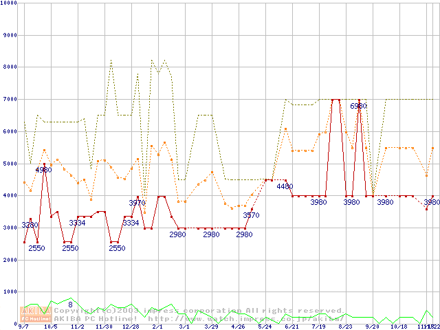 PC133 SDRAM DIMM CasLatency=3 ECC対応の最安値推移