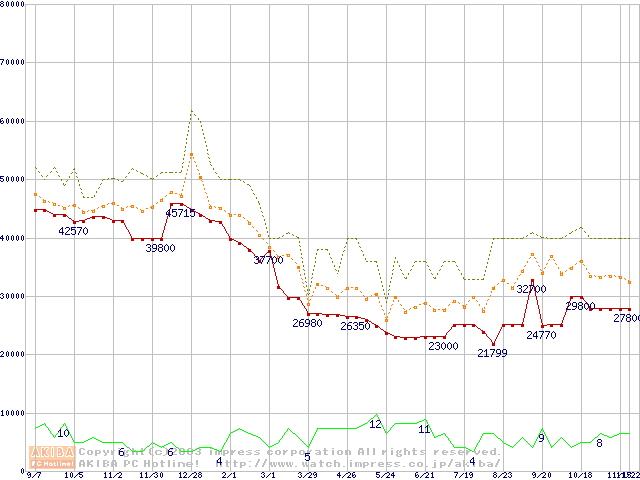 PC2100(DDR266) DDR SDRAM DIMM ECC対応 Registeredタイプの最安値推移