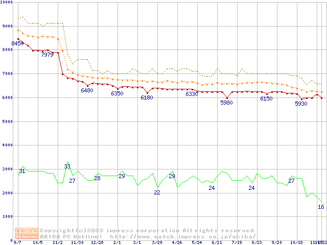 Socket 478 (micro-PGA,FSB 400MHz,L2 128KB,Willamette)の最安値推移