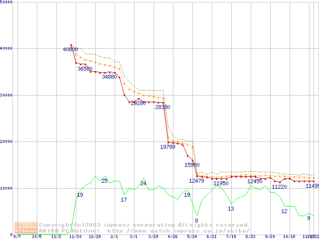 Socket A (OPGA,FSB 333MHz,L2 256KB,Thoroughbred)の最安値推移
