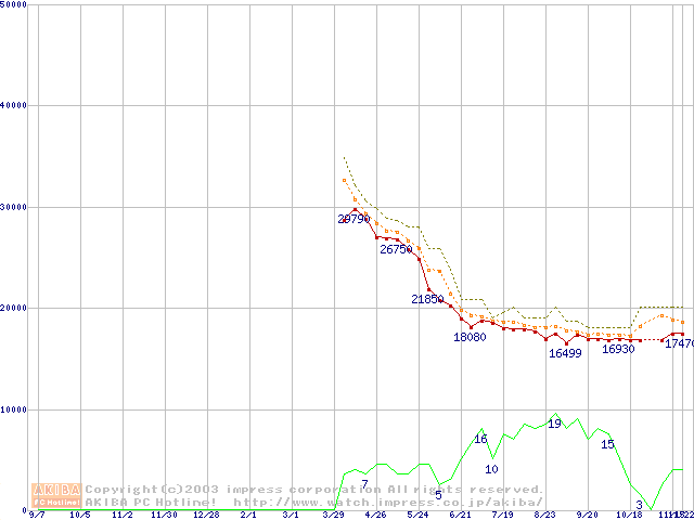 Travelstar 80GN (9.5mm,4200rpm,UltraATA/100,8MB,FDB,40GB/Platter)の最安値推移