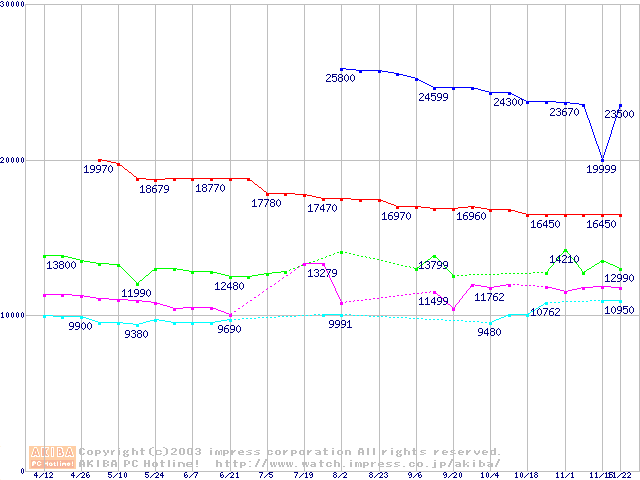| [↑前グラフ]: | MHT20x0AHシリーズ (9.5mm,5400rpm,UltraATA/100,8MB,FDB,40GB/Platter,FDB)の最安値推移 |