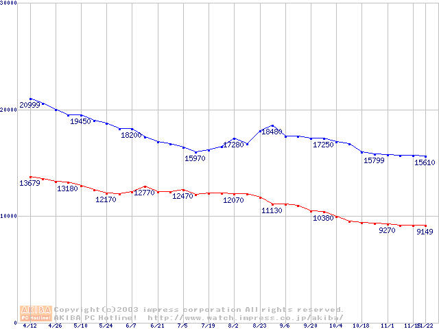 | [↑前グラフ]: | Deskstar 7K250 (7200rpm,UltraATA/100,FDB)の最安値推移 |