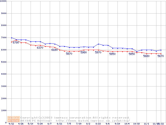 | [↑前グラフ]: | DiamondMax 16 (5400rpm,UltraATA/133,2MB,80GB/Platter,FDB)の最安値推移 |