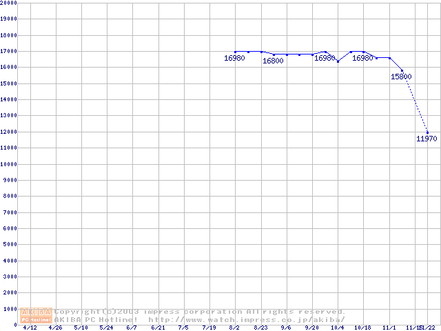 | [↓次グラフ]: | WD Caviar(Special Edition) (7200rpm,UltraATA/100,8MB)の最安値推移 |