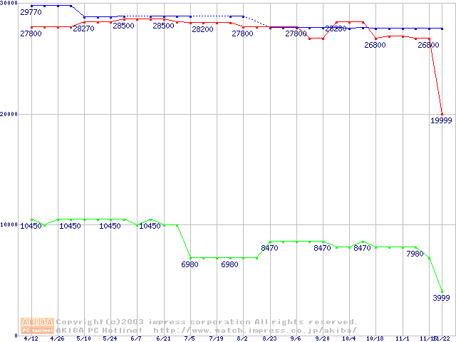 | [↑前グラフ]: | PC1066 DRDRAM RIMM ECC対応の最安値推移 |