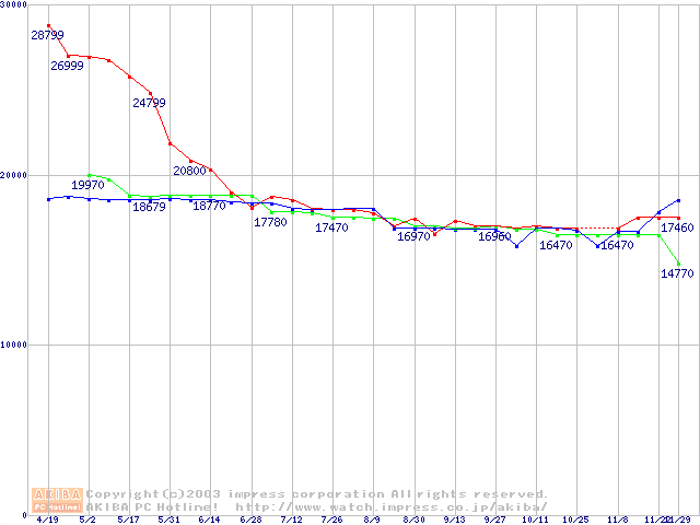 | [↑前グラフ]: | 2.5インチHDD 50GB~60GB以下(9.5mm厚,7200rpm)の最安値推移 |