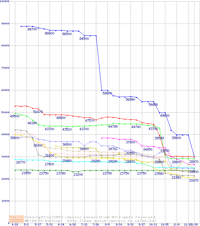 CPU主要製品(最安値2万円~3万円未満)の最安値推移