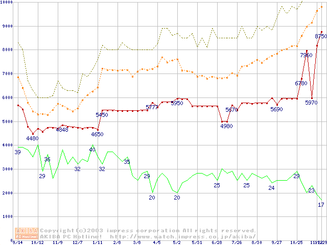 PC133 SDRAM DIMM CasLatency=3の最安値推移