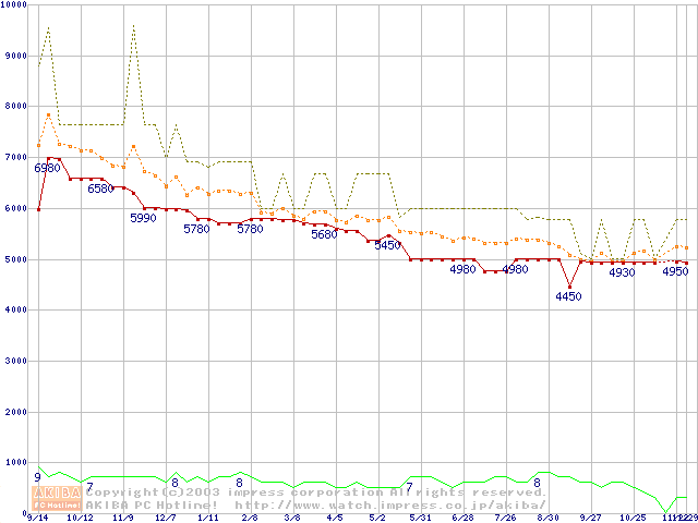 Socket A (PGA,FSB 266MHz,L2 256KB,Thunderbird)の最安値推移