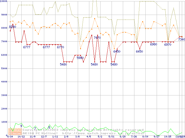 PC133 SDRAM DIMM CasLatency=3 ECC対応 Registeredタイプの最安値推移