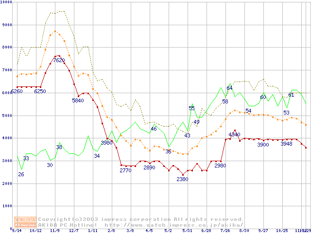 PC2700(DDR333) DDR SDRAM DIMMの最安値推移