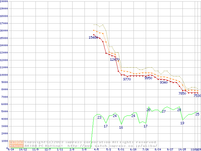 Socket 478 (micro-PGA,FSB 400MHz,L2 128KB,Northwood)の最安値推移