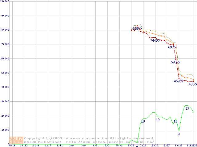 Socket 478 (micro-PGA,FSB 800MHz,L2 512KB,Hyper-Threading,Northwood)の最安値推移