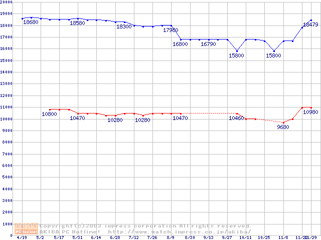 | [↓次グラフ]: | MHT20x0AHシリーズ (9.5mm,5400rpm,UltraATA/100,8MB,FDB,40GB/Platter,FDB)の最安値推移 |