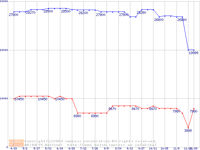 | [↑前グラフ]: | PC1066 DRDRAM RIMM ECC対応の最安値推移 |