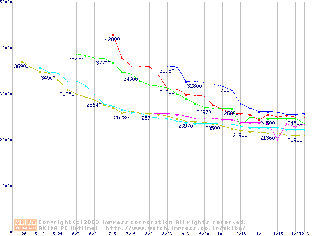 | [↓次グラフ]: | 2.5インチHDD 20GB~40GB未満(9.5mm厚)の最安値推移 |