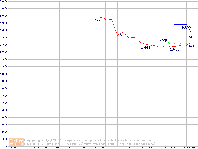 | [↑前グラフ]: | 2.5インチHDD 40GB~50GB未満(9.5mm厚,4200rpm)の最安値推移 |