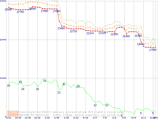 Socket 478 (micro-PGA,FSB 533MHz,L2 512KB,Northwood)の最安値推移