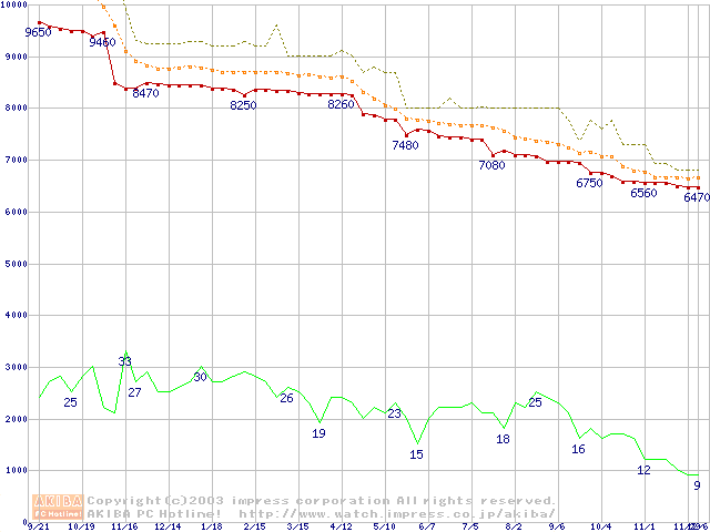Socket 478 (micro-PGA,FSB 400MHz,L2 128KB,Willamette)の最安値推移