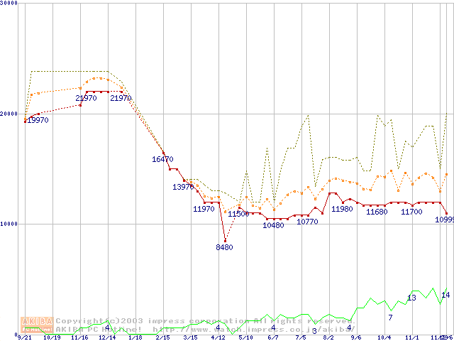 PC2700(DDR333) DDR SDRAM DIMM ECC対応 Registeredタイプの最安値推移