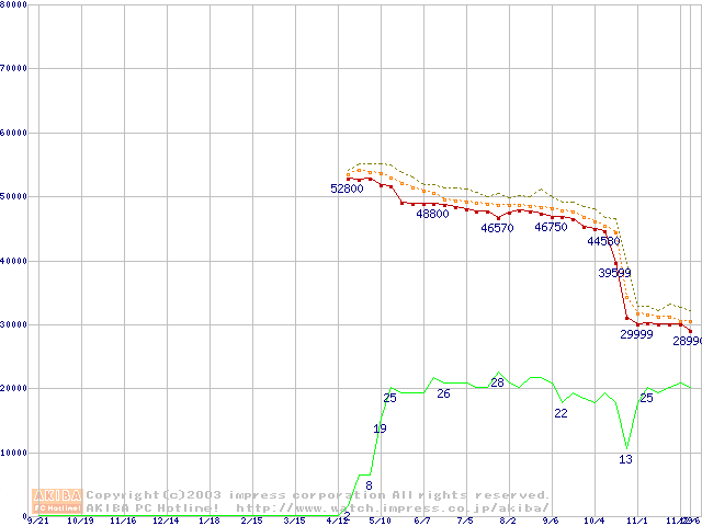 Socket 478 (micro-PGA,FSB 800MHz,L2 512KB,Hyper-Threading,Northwood)の最安値推移