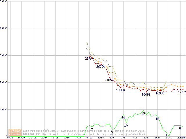 Travelstar 80GN (9.5mm,4200rpm,UltraATA/100,8MB,FDB,40GB/Platter)の最安値推移