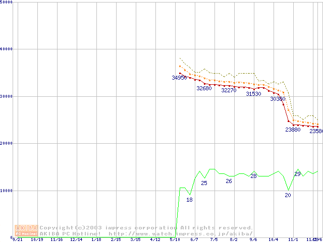 Socket 478 (micro-PGA,FSB 800MHz,L2 512KB,Hyper-Threading,Northwood)の最安値推移