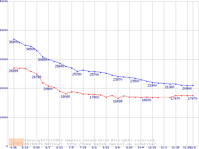 | [↑前グラフ]: | Travelstar DK23FB (9.5mm,5400rpm,UltraATA/100,8MB)の最安値推移 |