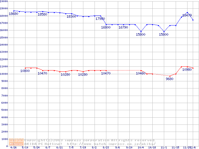 | [↑前グラフ]: | MKシリーズ (9.5mm,4200rpm,8MB,FDB,40GB/Platter)の最安値推移 |