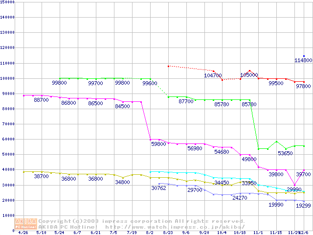 [↓次グラフ]: | Socket A (OPGA,FSB 400MHz,L2 512KB,Barton)の最安値推移 |