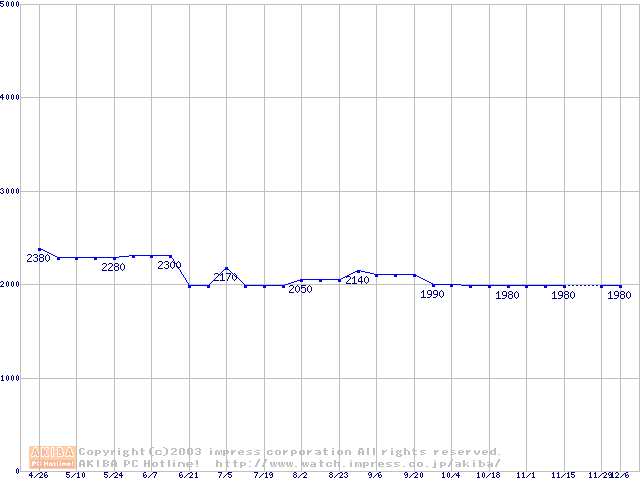 | [↑前グラフ]: | Socket A (OPGA,FSB 266MHz,L2 64KB,Applebred)の最安値推移 |