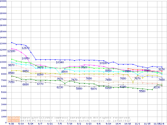 | [↑前グラフ]: | Socket A (OPGA,FSB 333MHz,L2 256KB,Thoroughbred)の最安値推移 |