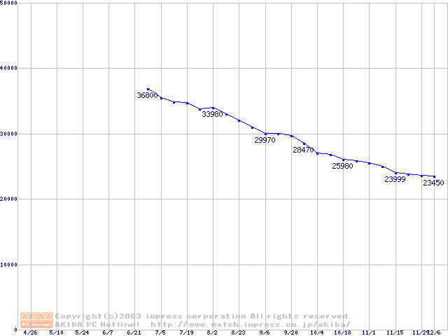 | [↑前グラフ]: | Deskstar 180GXP (7200rpm,2MB,UltraATA/100,FDB)の最安値推移 |