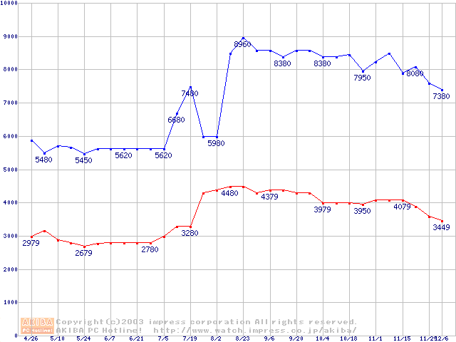 | [↑前グラフ]: | PC2100(DDR266) DDR SDRAM DIMM(CL 2.5)の最安値推移 |