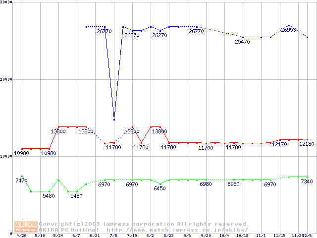 | [↑前グラフ]: | PC133 SDRAM DIMM CasLatency=3 ECC対応の最安値推移 |