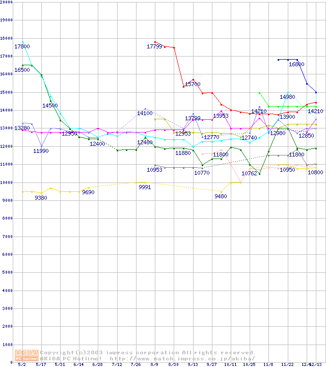 2.5インチHDD主要製品(最安値1万円~1万5千円未満)の最安値推移