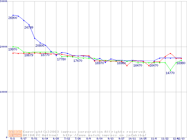 | [↓次グラフ]: | 2.5インチHDD 60GB~80GB未満(9.5mm厚,5400rpm)の最安値推移 |