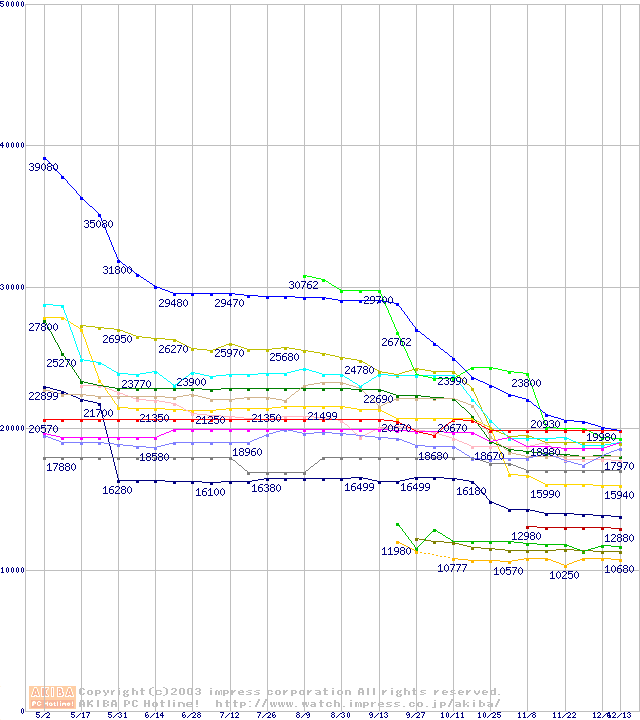 CPU主要製品(最安値1万円~2万円未満)の最安値推移