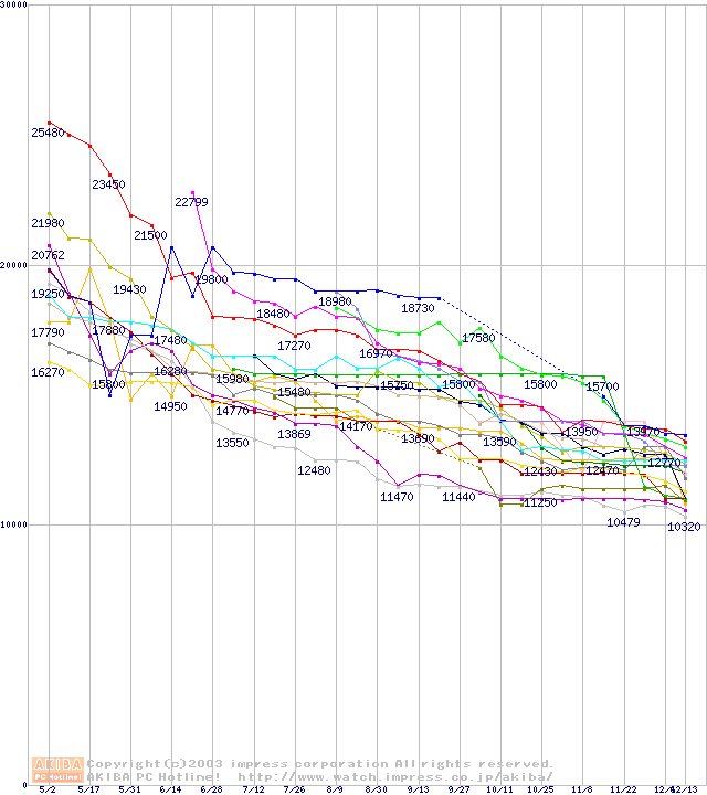HDD主要製品(最安値1万5千円~2万円未満)の最安値推移