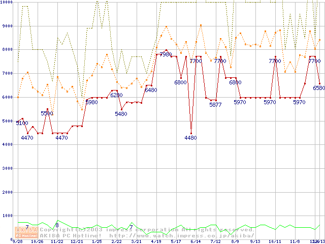 PC133 SDRAM DIMM CasLatency=3 ECC対応の最安値推移