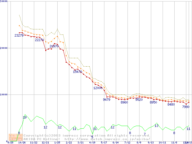 Socket A (OPGA,FSB 266MHz,L2 256KB,Thoroughbred)の最安値推移