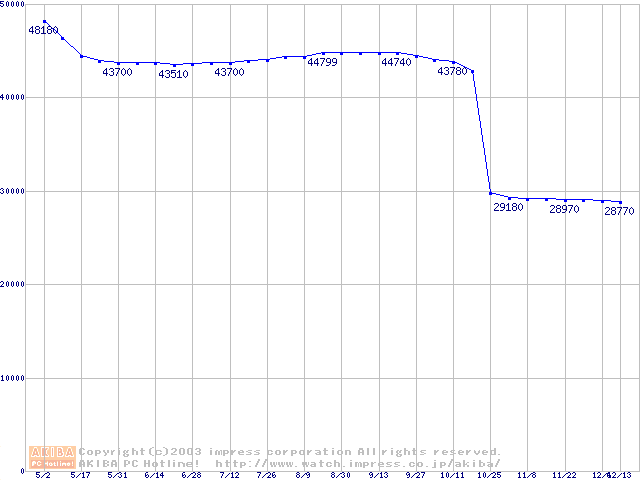 | [↑前グラフ]: | Socket 478 (micro-PGA,FSB 800MHz,L2 512KB,Hyper-Threading,Northwood)の最安値推移 |